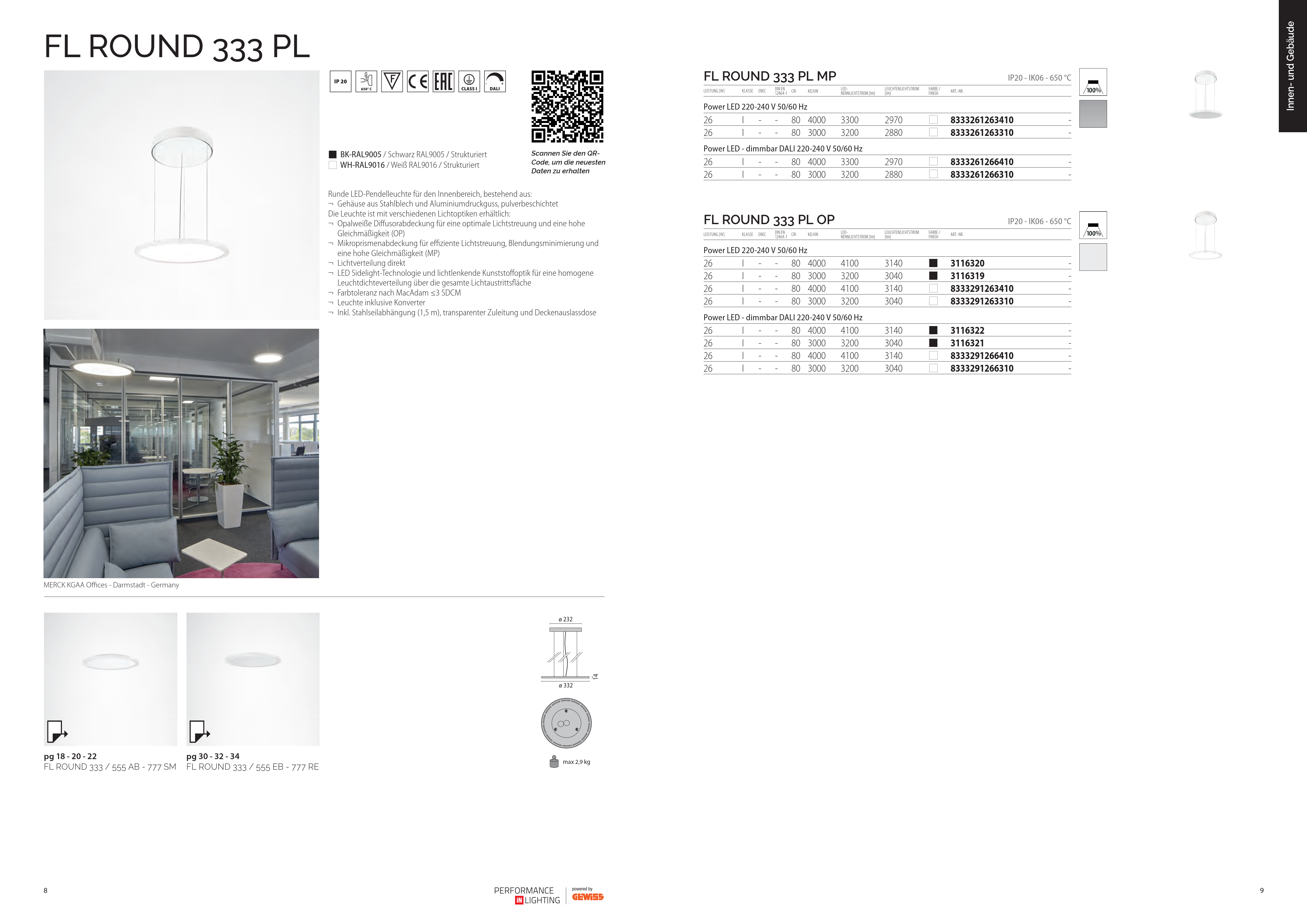 FL R+ 333 PL 8/23 S/A 8TW WH9016 DT8 OP Ø 329mm × 14mm 8 1010 126 2700//6500 <28 50000 DALI, DALI-2 FL R 333 PL 23 S/A 830 WH9016 MP