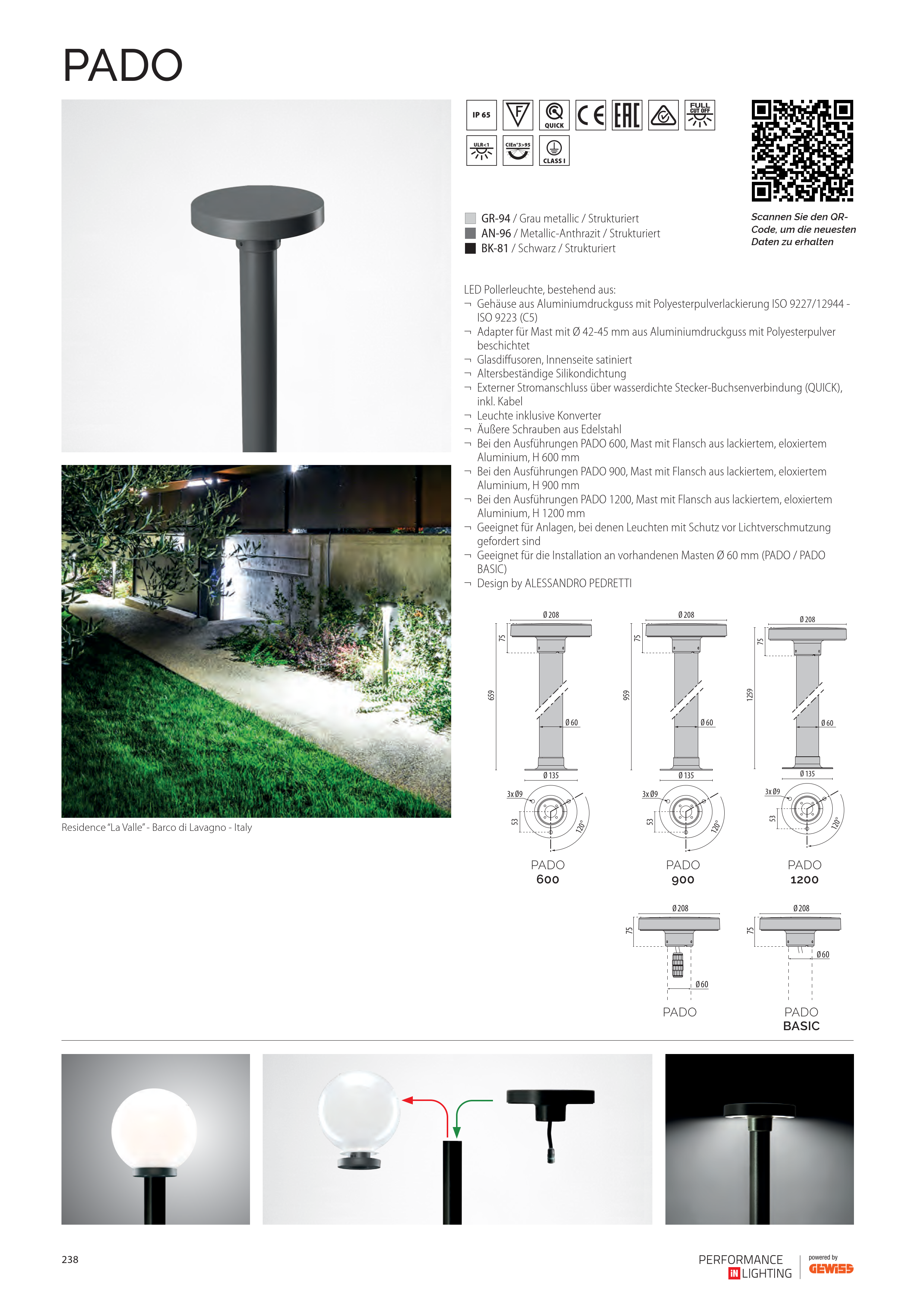 - Bei den Ausführungen PADO 600, Mast mit Flansch aus lackiertem, eloxiertem Aluminium, H 600 mm